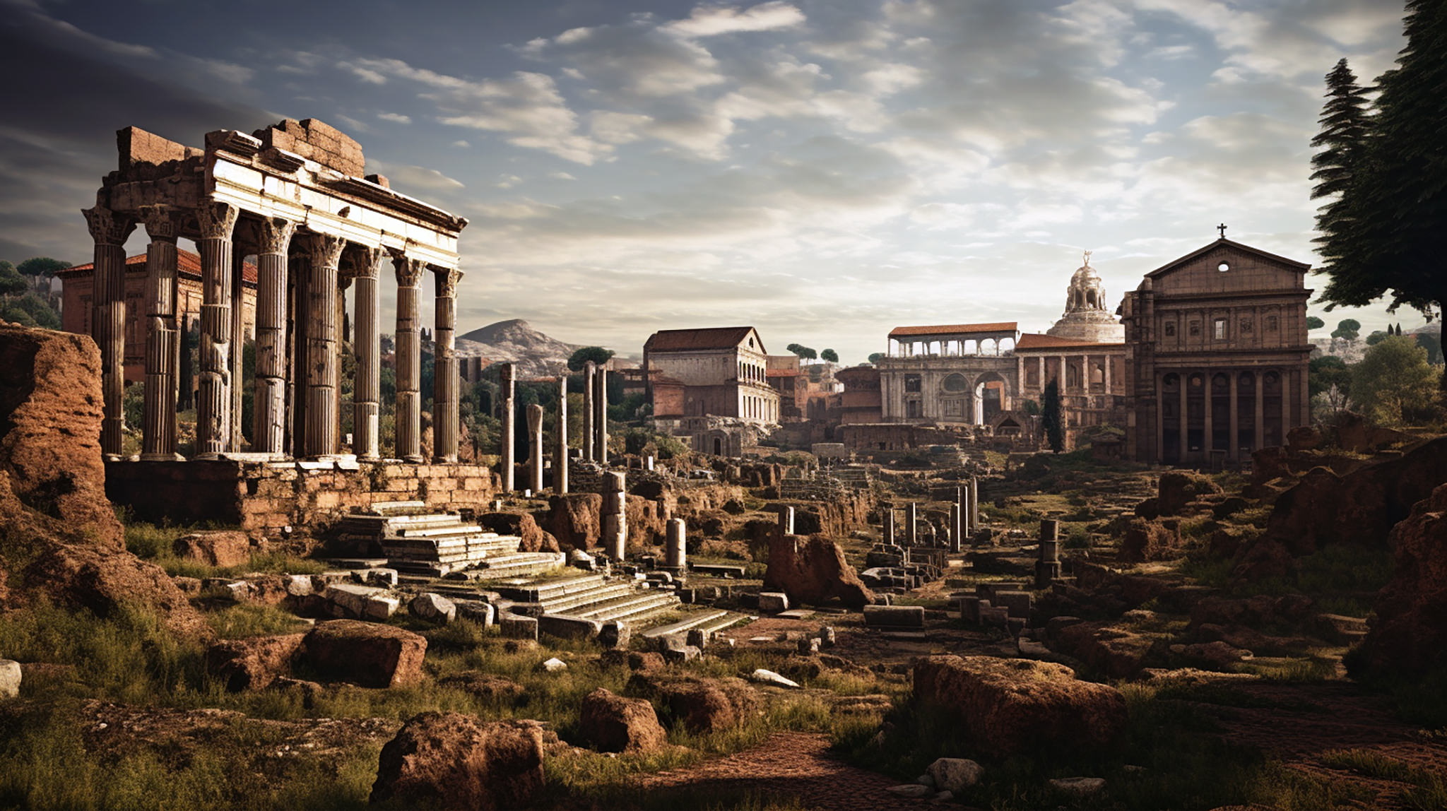 Dalla terrazza gli occhi sono immediatamente attratti dalle rovine di Roma Antica che, dopo essere stata una monarchia e prima di diventare un impero, fu una repubblica che sperimentò un'interessante distribuzione e bilanciamento dei poteri.